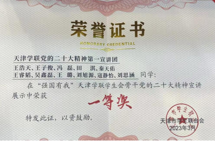 在本月初團市委、市學聯(lián)舉辦的天津?qū)W聯(lián)學生會骨干學習黨的二十大精神專題培訓班上,劉思涵同學深刻領會了習近平新時代中國特色社會主義思想和習近平總書記關于青年工作重要思想的精神實質(zhì)和豐富內(nèi)容,自身的理論素養(yǎng)、研究能力和實踐水平都有了大幅提升,在培訓班宣講匯演中獲得一等獎。