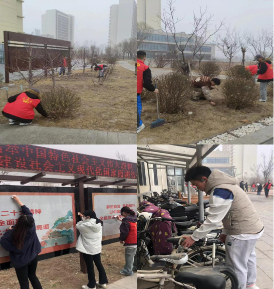 春日的陽光下,鮮艷亮麗的志愿紅,處處涌動著蓬勃生機(jī)。院學(xué)生會成員們身穿紅馬甲,手持掃帚、抹布、垃圾袋等工具,發(fā)揚(yáng)能吃苦、能戰(zhàn)斗的實(shí)干精神,對宿舍樓下衛(wèi)生死角、校園內(nèi)雜草、綠化帶“白色垃圾”、宣傳牌等進(jìn)行了全面清理,同學(xué)們積極發(fā)揮雷鋒精神,不怕臟、不怕累,個個奮力爭先,互相合作,熱火朝天地投入到打掃中去,讓垃圾無處可逃。同學(xué)們自覺踐行雷鋒精神,爭做文明傳播者,傳遞正能量,用無聲的行動切實(shí)提高了校園的“顏值”。