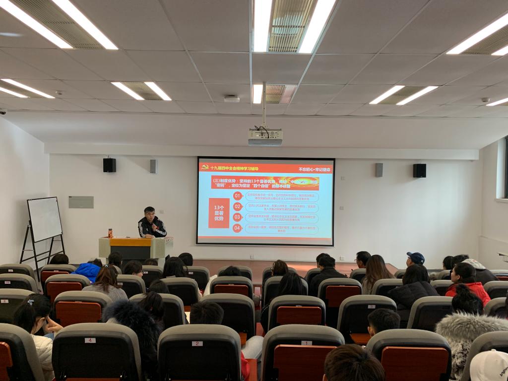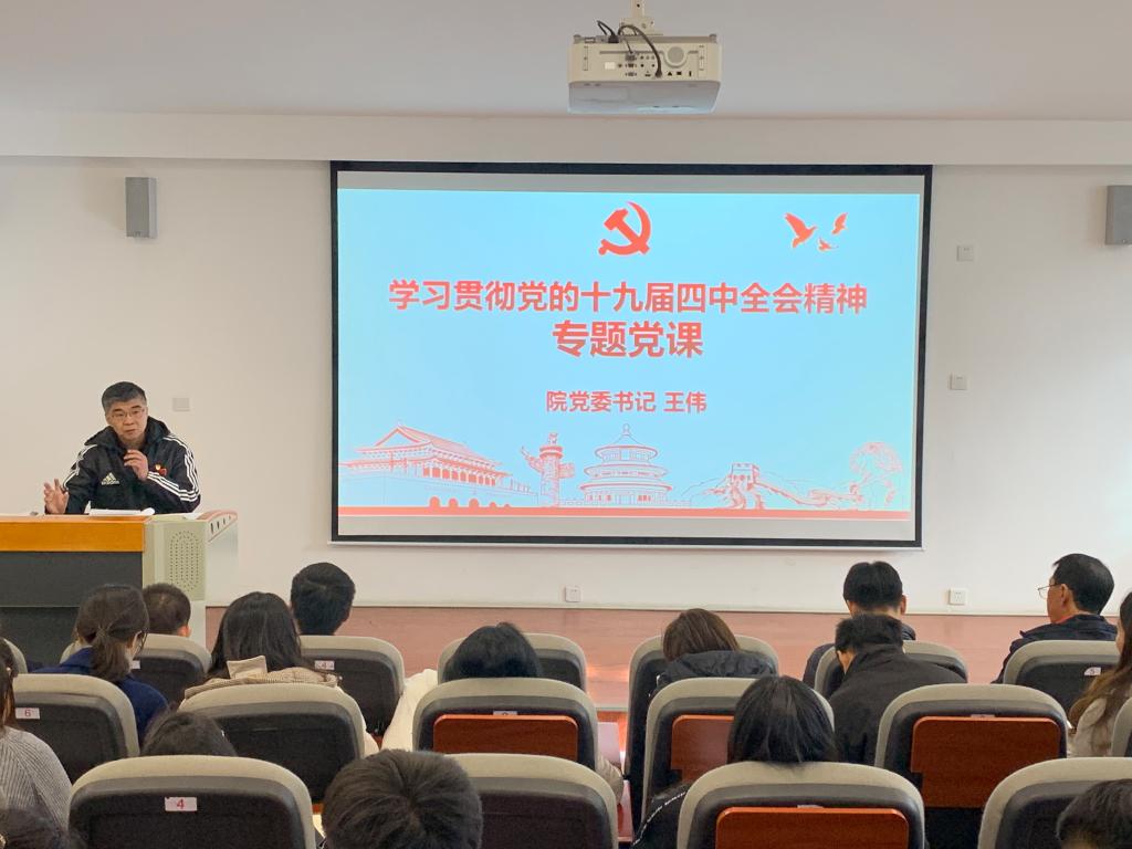 為深入學習宣傳貫徹黨的十九屆四中全會精神,按照局黨委、市委教育兩委的部署要求,11月27日上午,學院黨委書記王偉在第一階梯教室講授黨的十九屆四中全會精神專題黨課。院紀委書記沈茹劼、全體教職員工、部分團員干部和學生入黨積極分子參會。