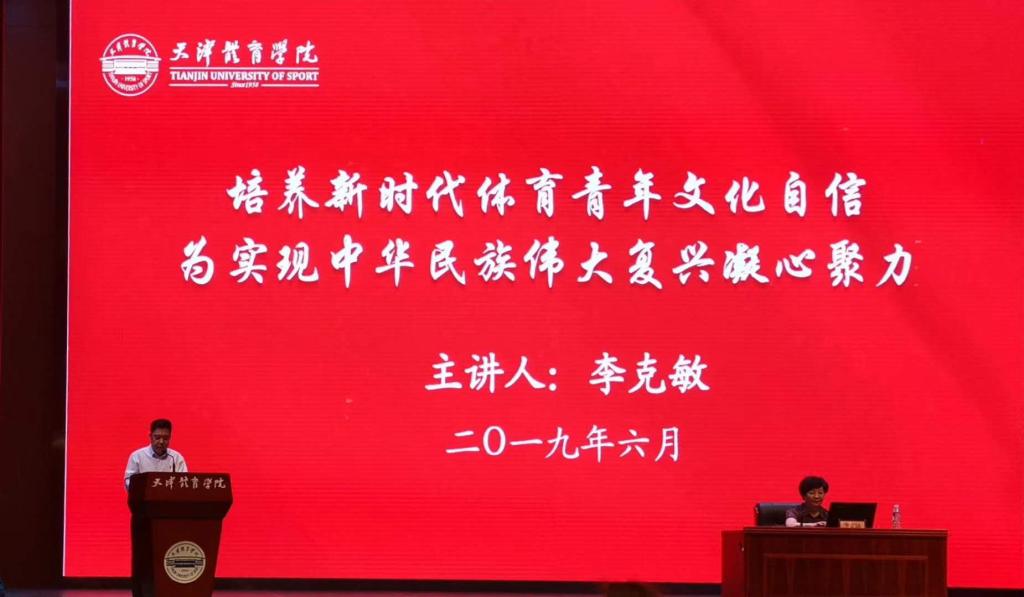 習近平總書記主持召開學校思想政治理論課教師座談會并發表重要講話,要求各地區各部門負責同志要積極到學校去講思政課。為貫徹落實習近平總書記重要講話精神。按照天津市委教育領導工作小組下發的津黨教〔2019〕4號《關于領導干部進校園開展思想政治工作的通知》要求,6月13日下午,天津市體育局黨委書記、局長李克敏以“培養新時代體育青年文化自信,為實現中華民族偉大復興凝心聚力”為主題的思政課在天津體育學院進行。體職院黨委副書記、院長劉欽龍、教師和學生代表共計160余人聆聽本次思政課。