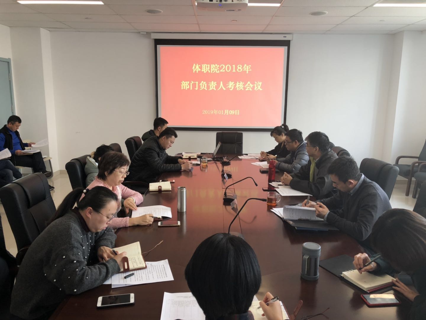 2019年1月9日下午,體職院在二樓會議室召開2018年度考核會議,院黨委書記王偉、院黨委副書記、院長劉欽龍、副院長魏秋月,各處室、系部負責人參會。會議由人事部負責人主持。