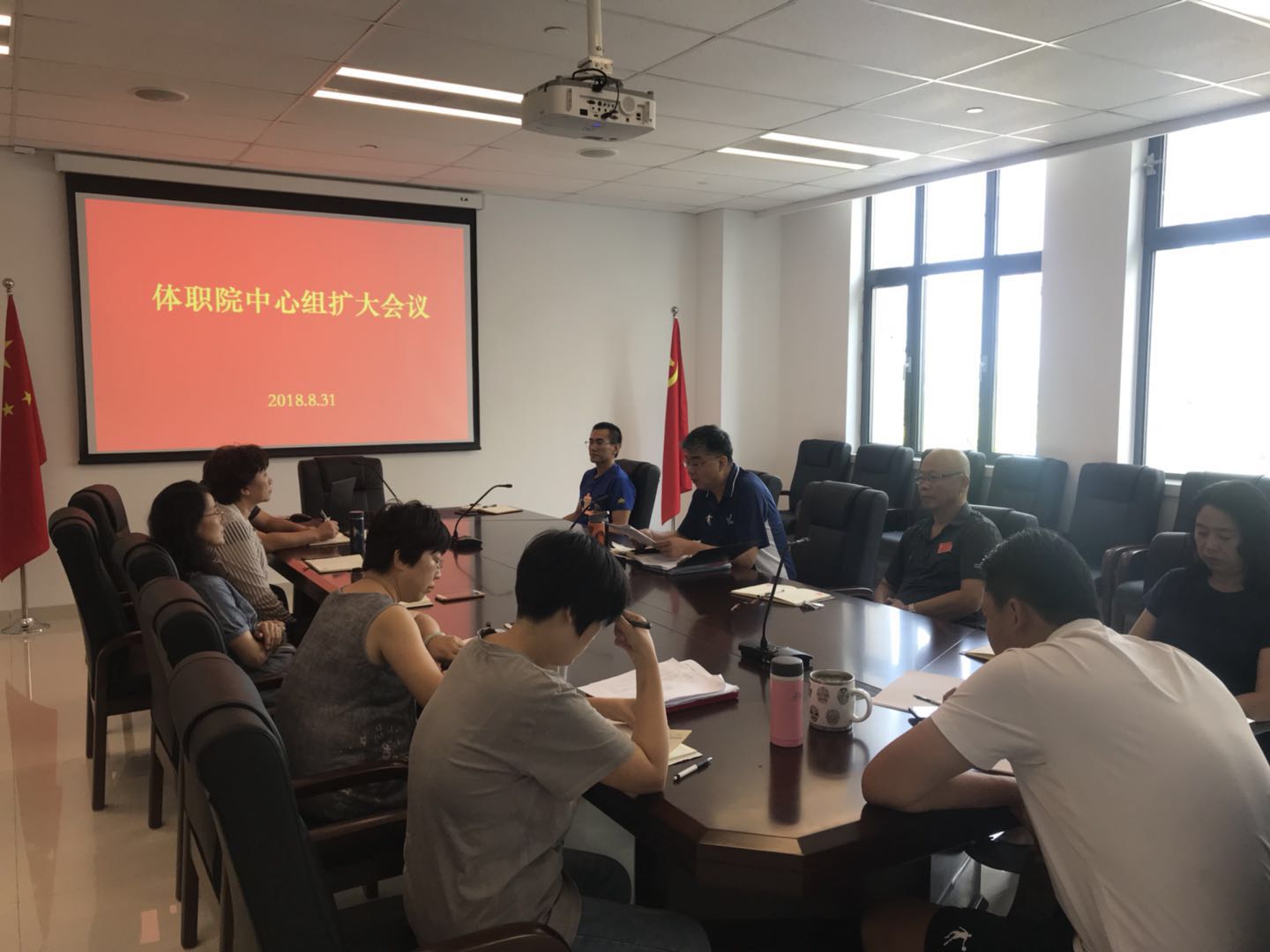 2018年8月31日,體職院在二樓會議室召開中心組擴大會議,學院黨委書記王偉出席并主持,學院各處室、系部負責人,各黨支部書記參加。