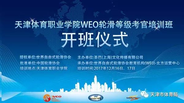 2017年12月16日—17日,為推動輪滑運動健康、規范、科學、有序發展,培養輪滑項目技術技能型人才,擴寬學生就業渠道,由世界自由式輪滑協會授權,中國輪滑協會批準,圣巴(上海)文化傳播有限公司主辦,WEO北方運營中心——行健極遠(天津)文化傳播有限公司承辦的首屆高校WEO自由式輪滑等級考官培訓班在天津體育職業學院舉行。