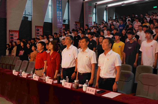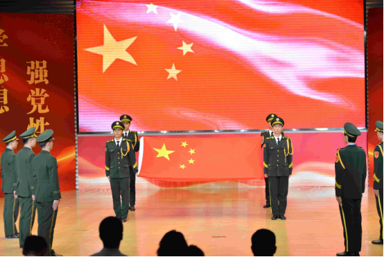 在全場(chǎng)的莊嚴(yán)注目下,學(xué)院國(guó)旗護(hù)衛(wèi)隊(duì)出旗,全場(chǎng)奏唱中華人民共和國(guó)國(guó)歌。