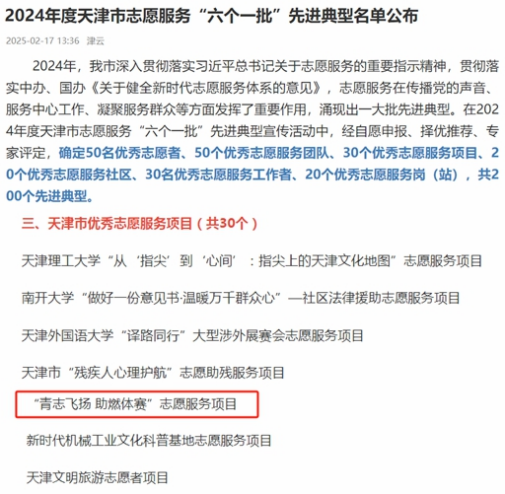 近日,2024年度天津市志愿服務“六個一批”先進典型名單公布,由體職院報送的“青志飛揚 助燃體賽”志愿服務項目獲評“天津市優秀志愿服務項目”。