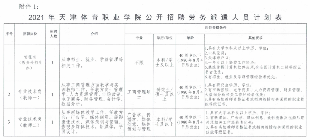 (三)崗位所需的其他條件詳見《2021年天津體育職業(yè)學(xué)院公開招聘勞務(wù)派遣人員計(jì)劃表》(附件1)