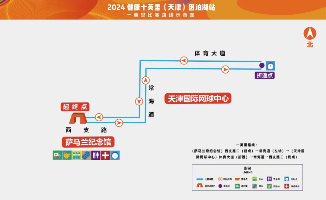 十英里:(薩馬蘭奇紀念館)西支路二(起點)→常海道(左轉)→體育大道(右轉)→洪澤湖路(左轉)→鄱陽湖路→團泊湖鳥類自然保護區(右轉)→環湖西路(折返)→鄱陽湖路→洪澤湖路→體育大道→常海道→西支路二(終點)